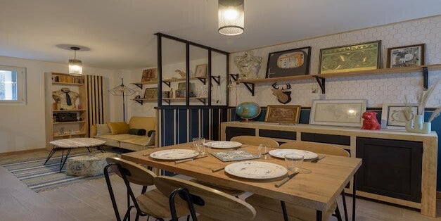 - Une cuisine équipée avec notamment : bouilloire électrique, four, four à micro-ondes, grille-pain, lave-vaisselle, plaques de cuisson...avec un espace repas